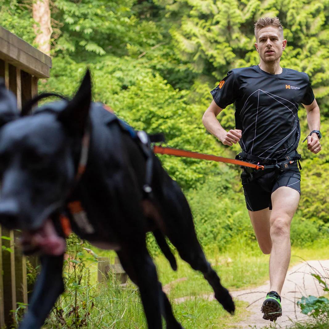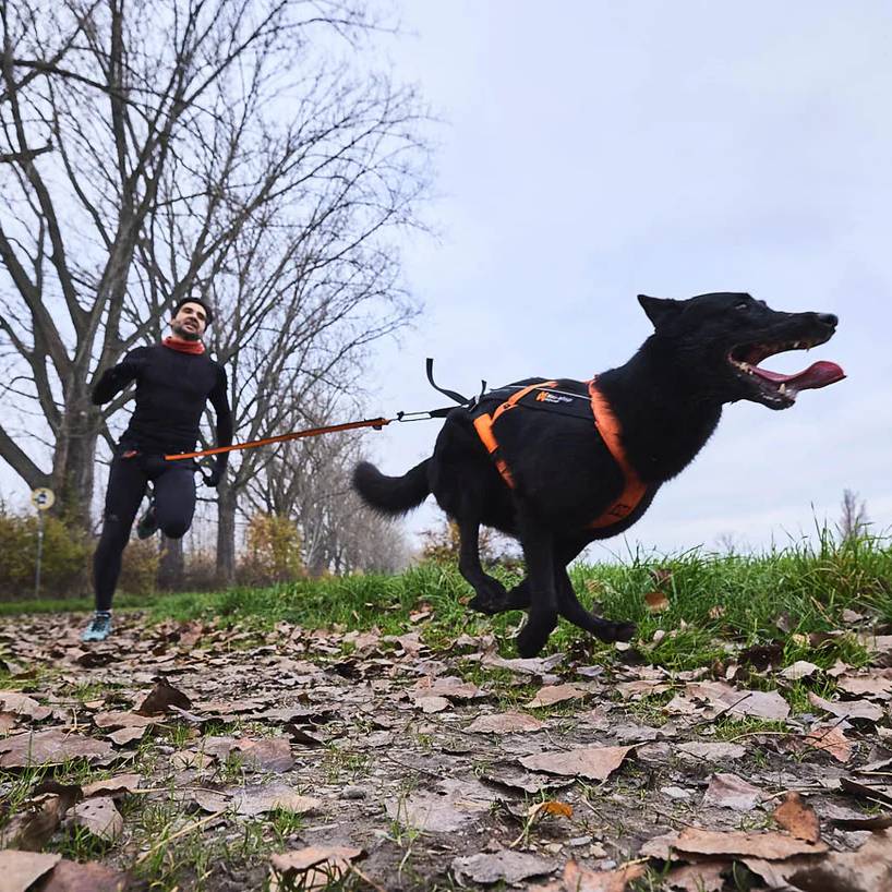 A bungee leash developed for canicross, bikejoring, and skijoring. The entire length is elastic to give you and your dog a smooth experience when training together.