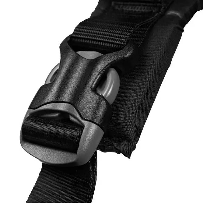 Line harness 5.0 is adjustable around the chest. After the initial adjustment, it is easy to put the harness on and take it off by opening the solid Duraflex® buckles on each side. Lock the chest straps by simply threading the end of the strap back through the sliplock.