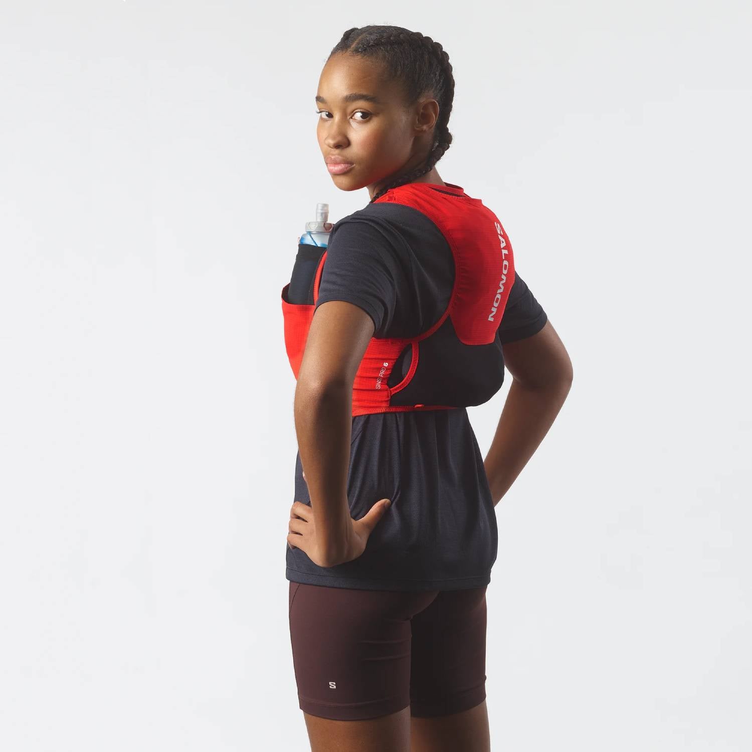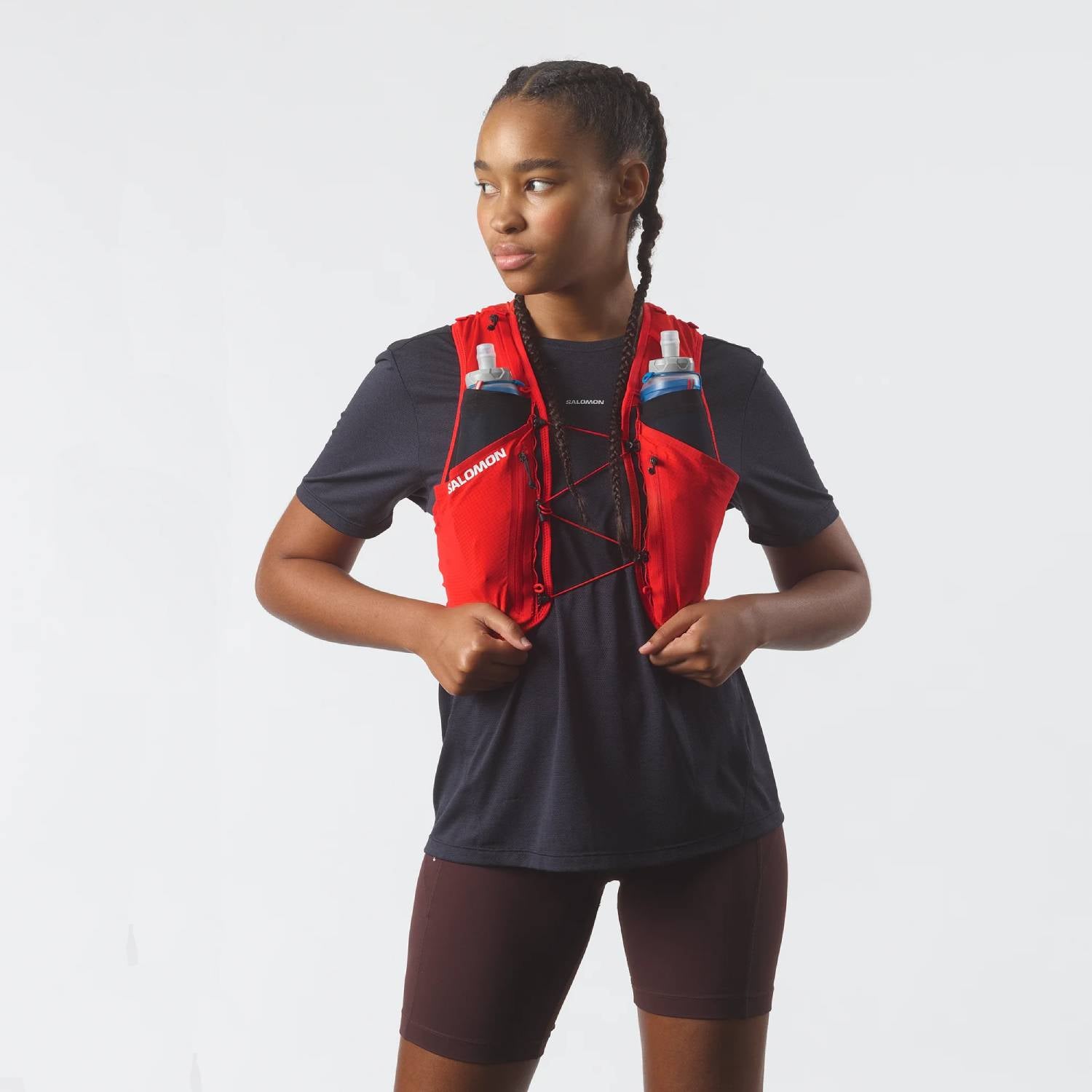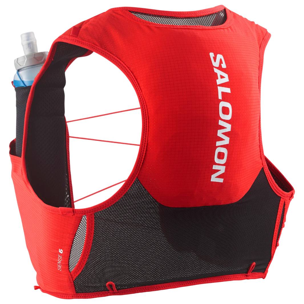 2 front flask pockets: Designed to fit Salomon soft flasks, these front pockets limit bouncing. Top elastic loops secure your flasks and keep them ready to drink.