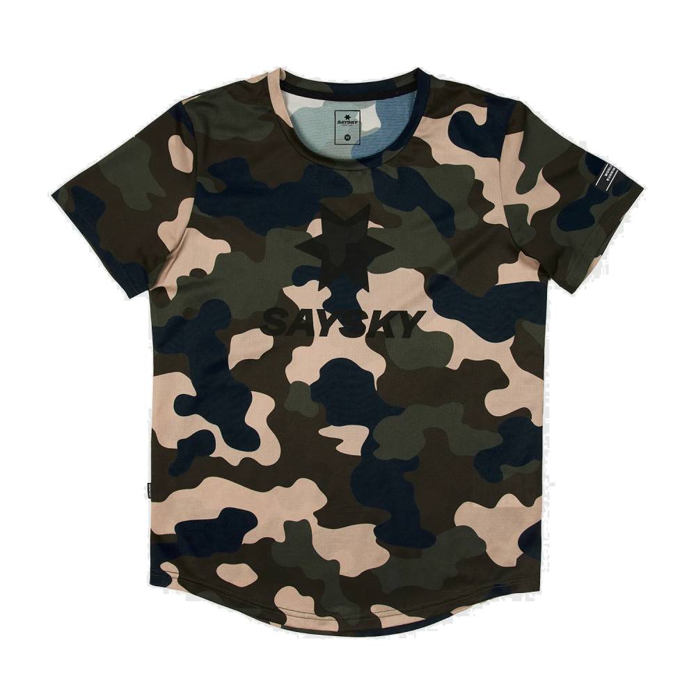The SAYSKY Camo Combat T-shirt is a short sleeve running t-shirt in a camo print. It's made from recycled polyester and comes with a classic waterprint SAYSKY logo on the front, a woven label on the back, and a WORLDWIDE RUNNING TRIBE label on the arm. The fit is regular with a soft fabric feel and high level of breathability.