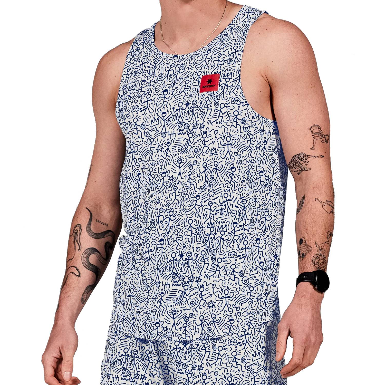 The SAYSKY Contemporary Cartoons Combat Singlet is a regular race singlet in white with a blue all over hand drawn stick figure animation print, a woven label on the front and a printed label on the back. The singlet is moisture-wicking and quick-drying, which ensures high breathability and increased airflow. The technical construction reduces the fabric’s ability to cling to your skin.