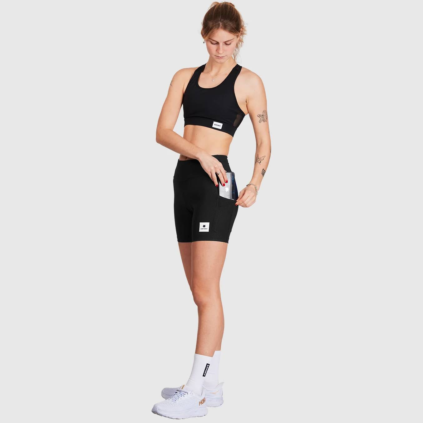 The SAYSKY women's Combat+ Short Tights 7" is a pair of short women's running tights made from recycled polyester. They come in maritime blue with a woven SAYSKY logo on the left leg and on the waist. The short tights also feature side pockets. The fit is slim with a regular waist. This particular model is very good for the transitional seasons as an alternative to long tights.