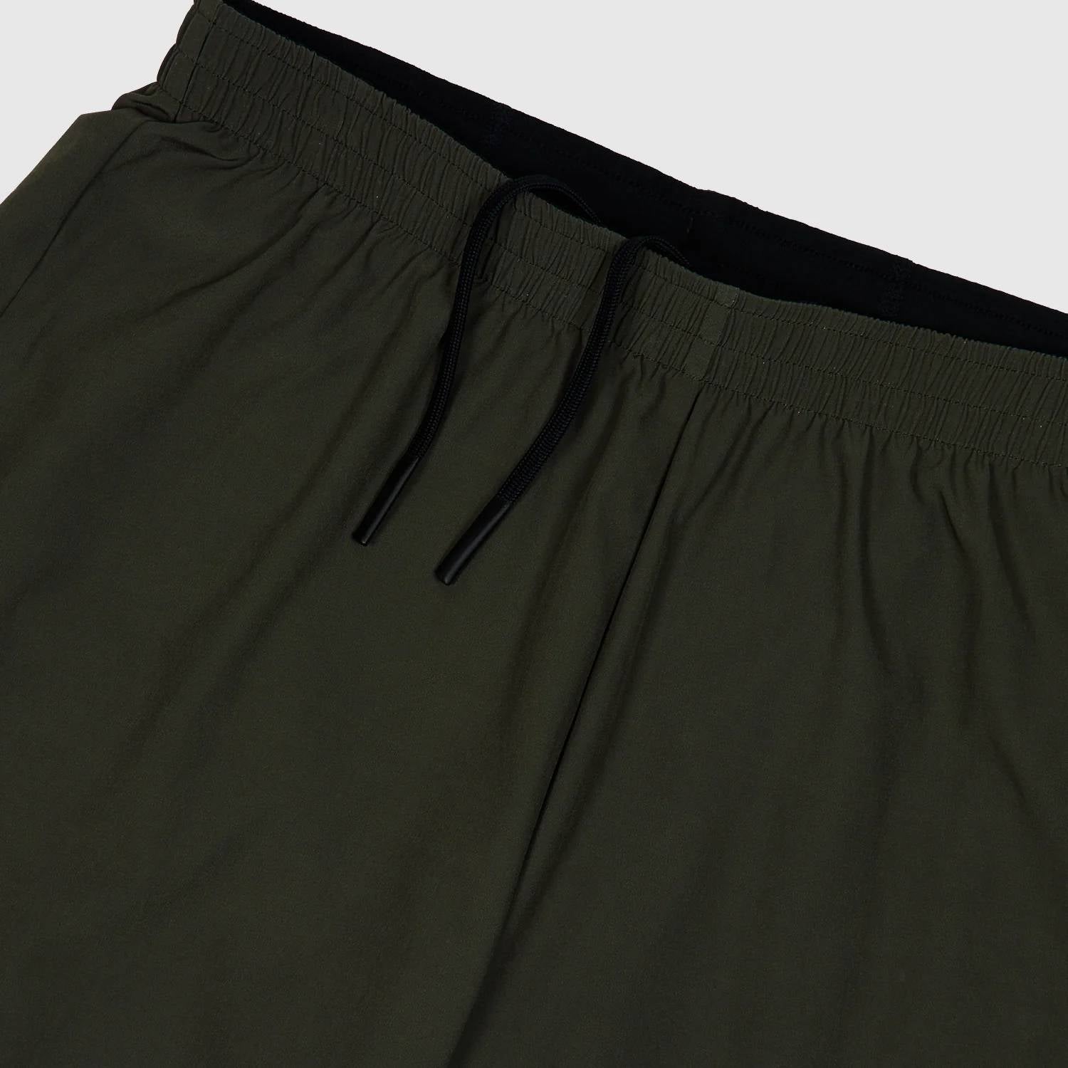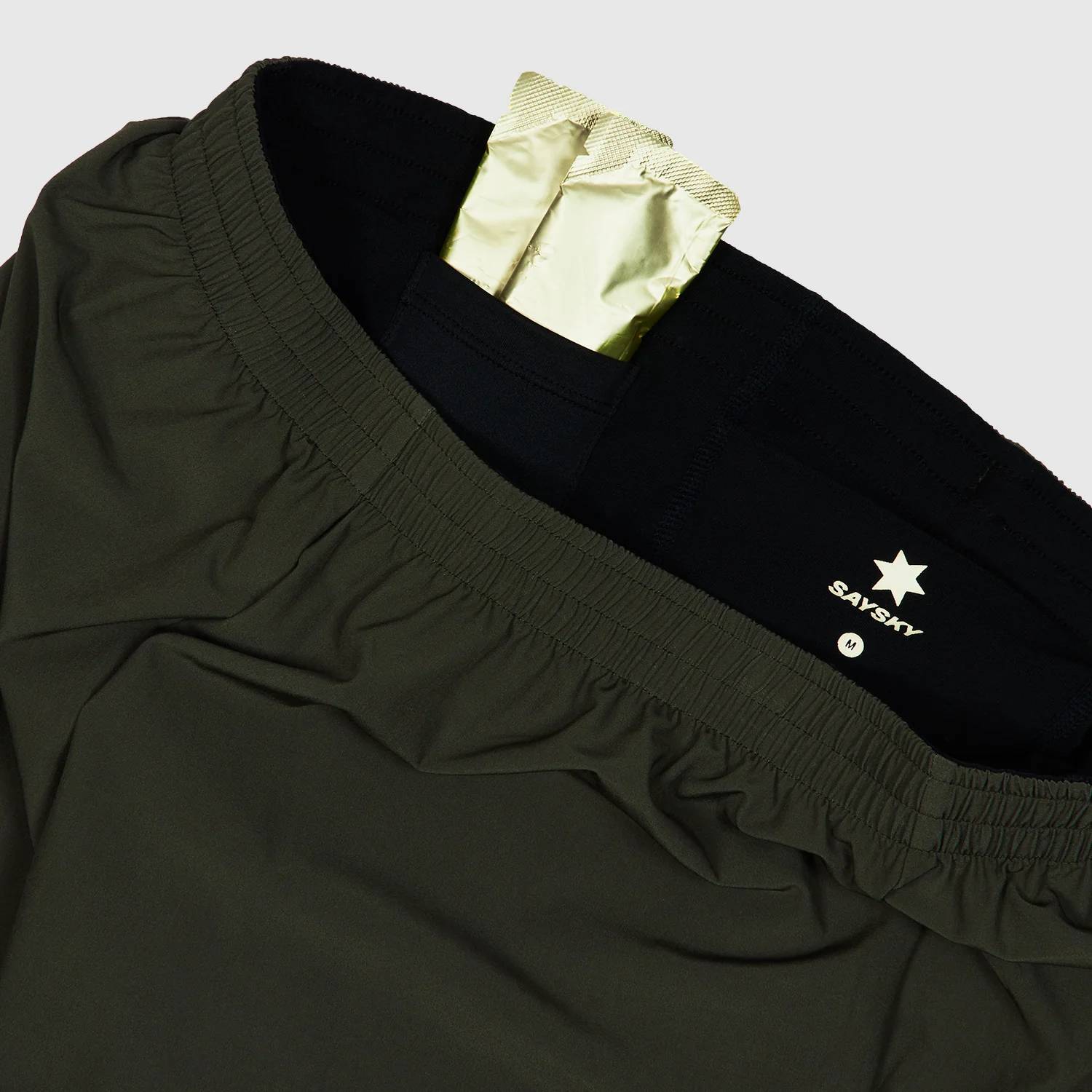 The SAYSKY 2 in 1 Shorts 5'' are one of our most popular styles. This version comes with olive green outer shorts and black inner pants. There's a woven SAYSKY label in white on the front and a SAYSKY logo on the back in black.