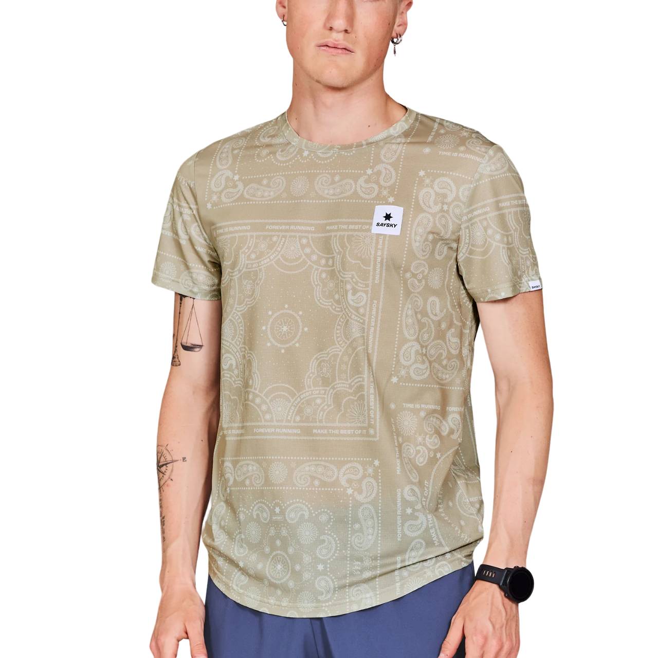 The SAYSKY Paisley Combat T-shirt is a running t-shirt with an allover Saysky paisley print; it has a woven label on the front and back. The t-shirt is moisture-wicking and quick-drying, which ensures high breathability and increased airflow. The technical construction of the fabric reduces the fabric’s ability to cling to your skin.