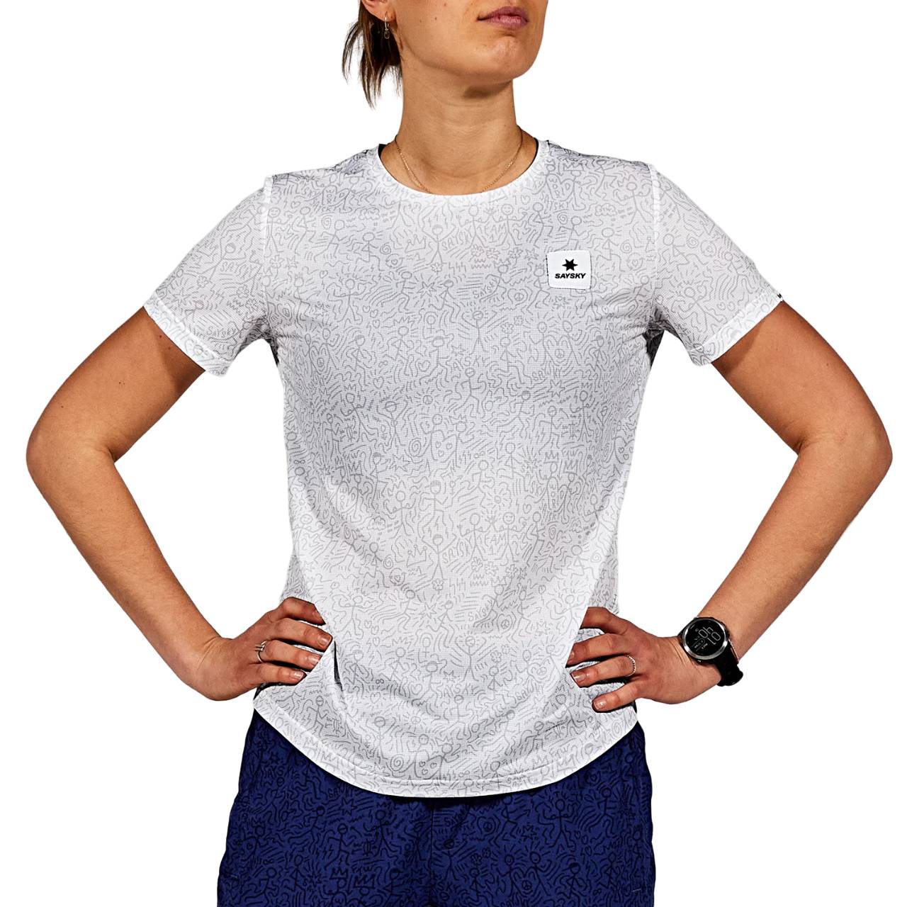 The SAYSKY Contemporary Cartoons Combat T-shirt is a women's short sleeve running t-shirt in white with an all over hand drawn stick figure animation print in beige, and a woven SAYSKY label on the front and back. The T-shirt is moisture-wicking and quick-drying, which ensures high breathability and increased airflow.