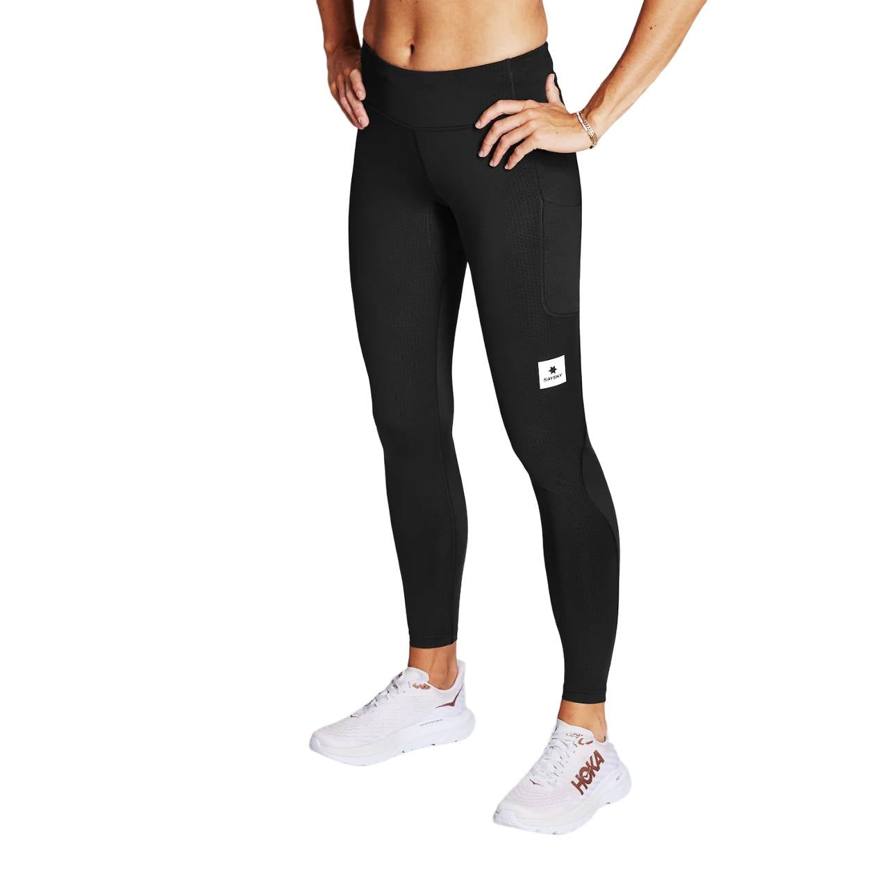 The SAYSKY Combat+ Tights is a pair of women's long tights in black made from recycled polyester. They come with a reflective woven SAYSKY logo on the front and a reflective SAYSKY logo on the side of the left calf. The long tights also feature side pockets.