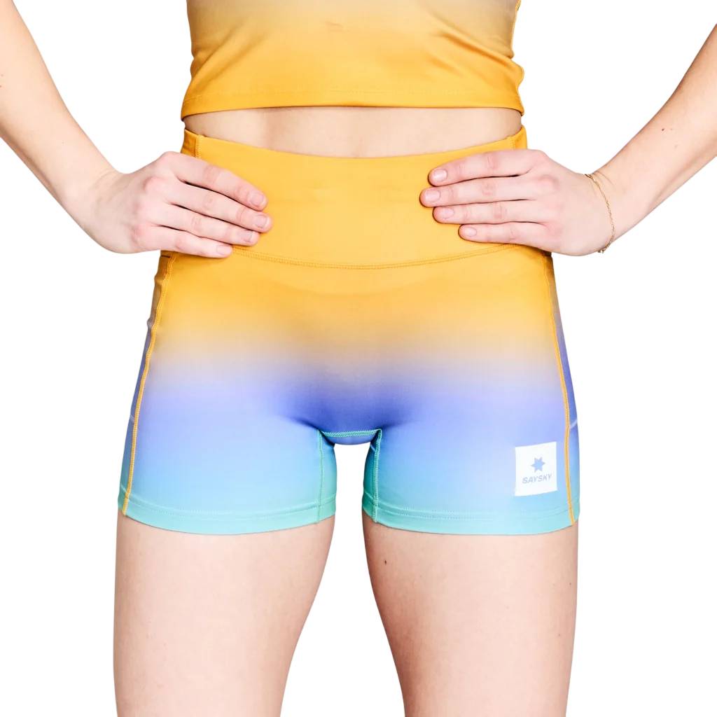 The SAYSKY Drip Dye Combat+ Short Tights 4" are women's running tights made from recycled polyester with an eye-catching dip dye print – just as refreshing as those summer runs you're dreaming of. They feature side pockets for essentials and a back zip-pocket for keys or gels. Designed for performance, these short tights offer a comfortable and supportive fit for intense training and race day efforts.