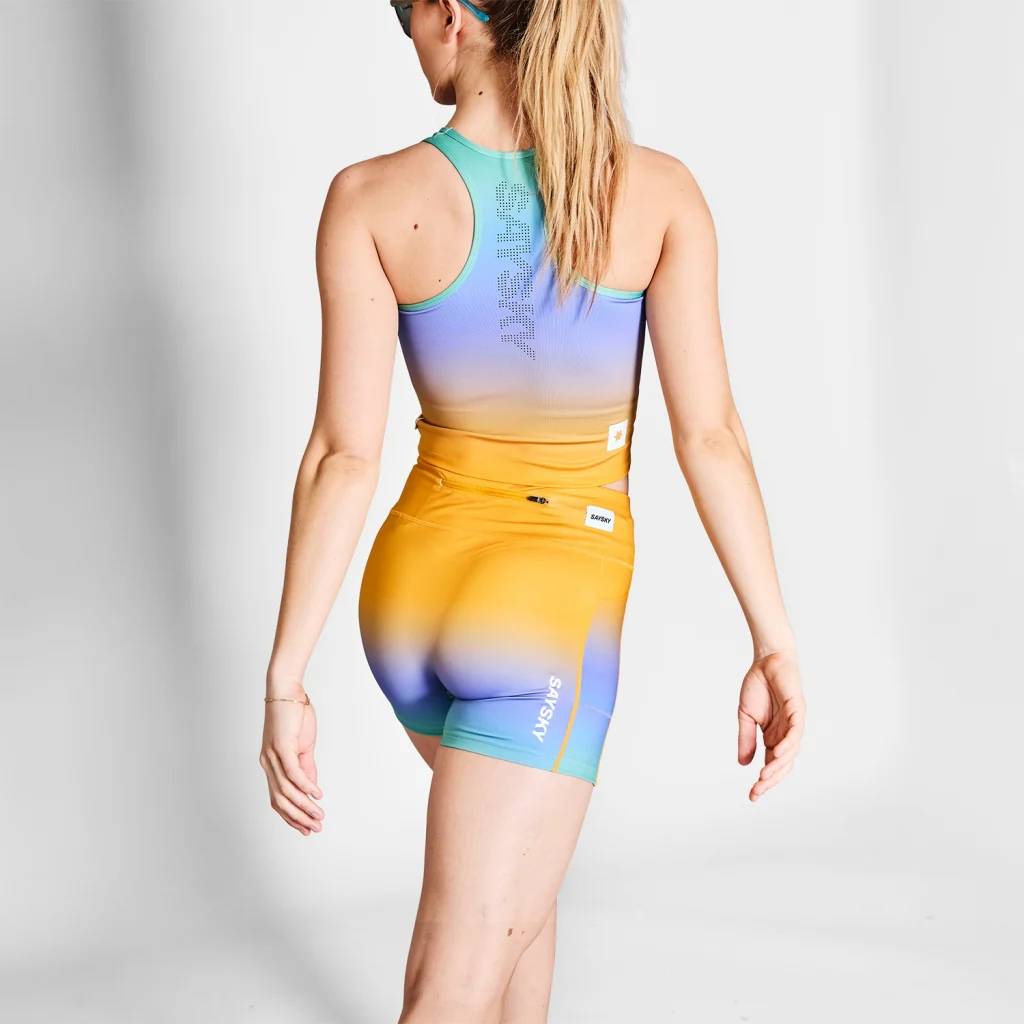 The SAYSKY Drip Dye Combat+ Short Tights 4" are women's running tights made from recycled polyester with an eye-catching dip dye print – just as refreshing as those summer runs you're dreaming of. They feature side pockets for essentials and a back zip-pocket for keys or gels. Designed for performance, these short tights offer a comfortable and supportive fit for intense training and race day efforts.