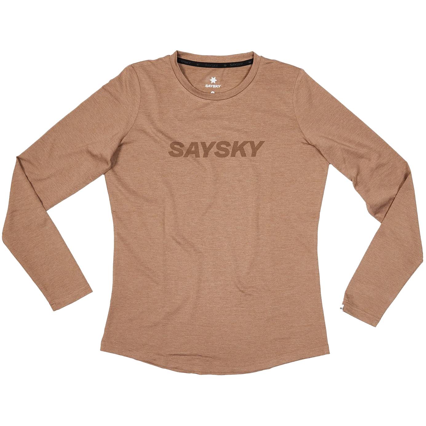The SAYSKY Logo Pace Long Sleeve is a running t-shirt for women in green made from recycled polyester. It comes with a SAYSKY logo on the front and a woven SAYSKY label on the back.