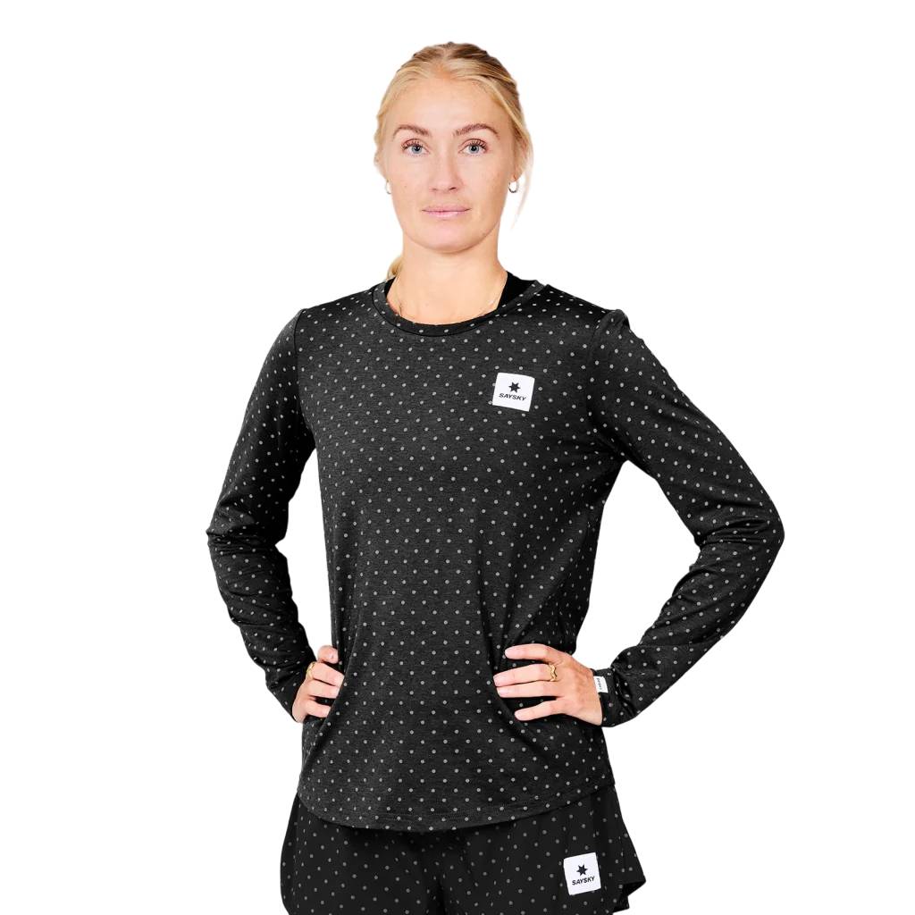 The SAYSKY Reflective Polka Pace Long Sleeve is a long sleeve running t-shirt with an allover reflective polka dot print. Our pace fabric is ideal if you're looking for a slightly heavier, yet super soft fabric with great wicking abilities.