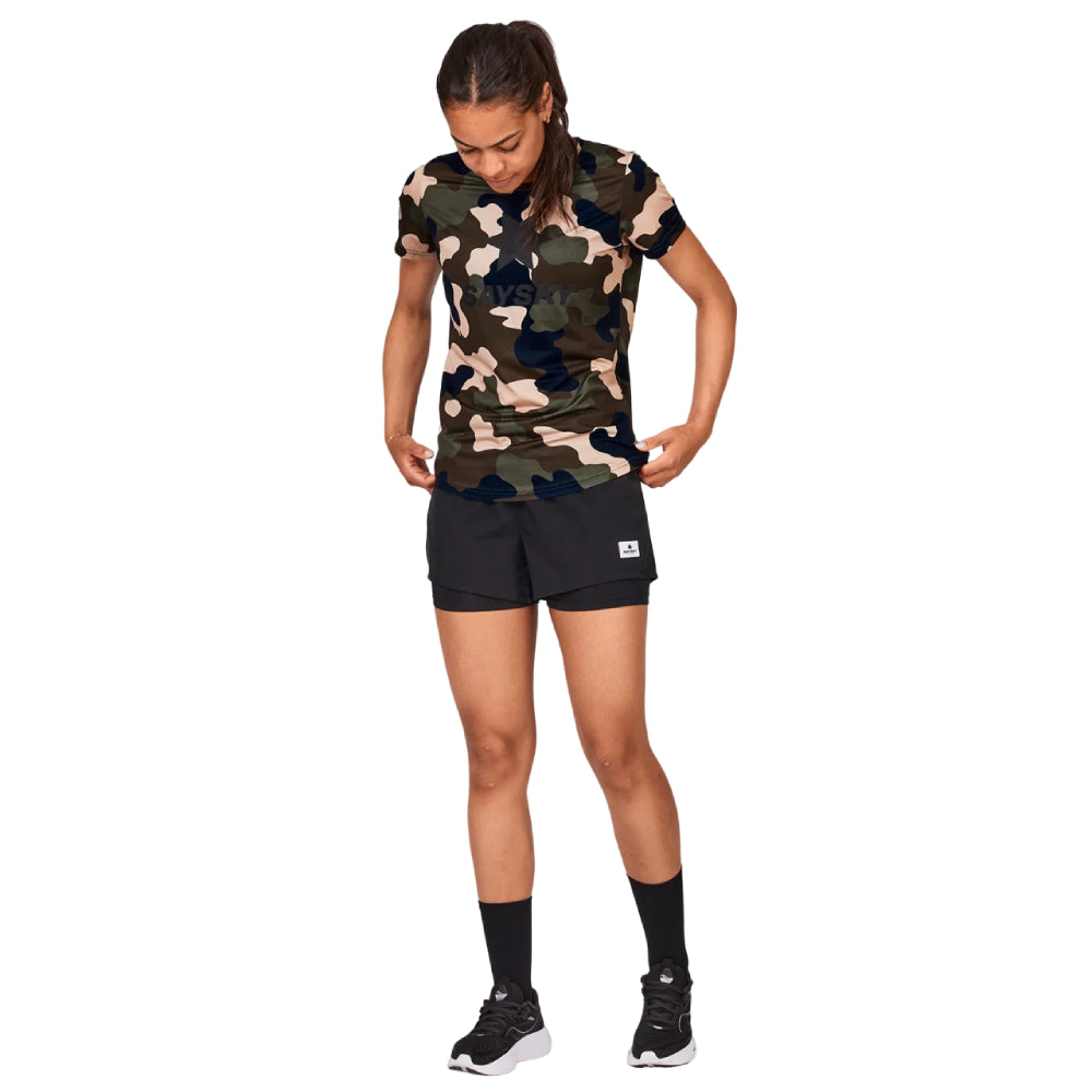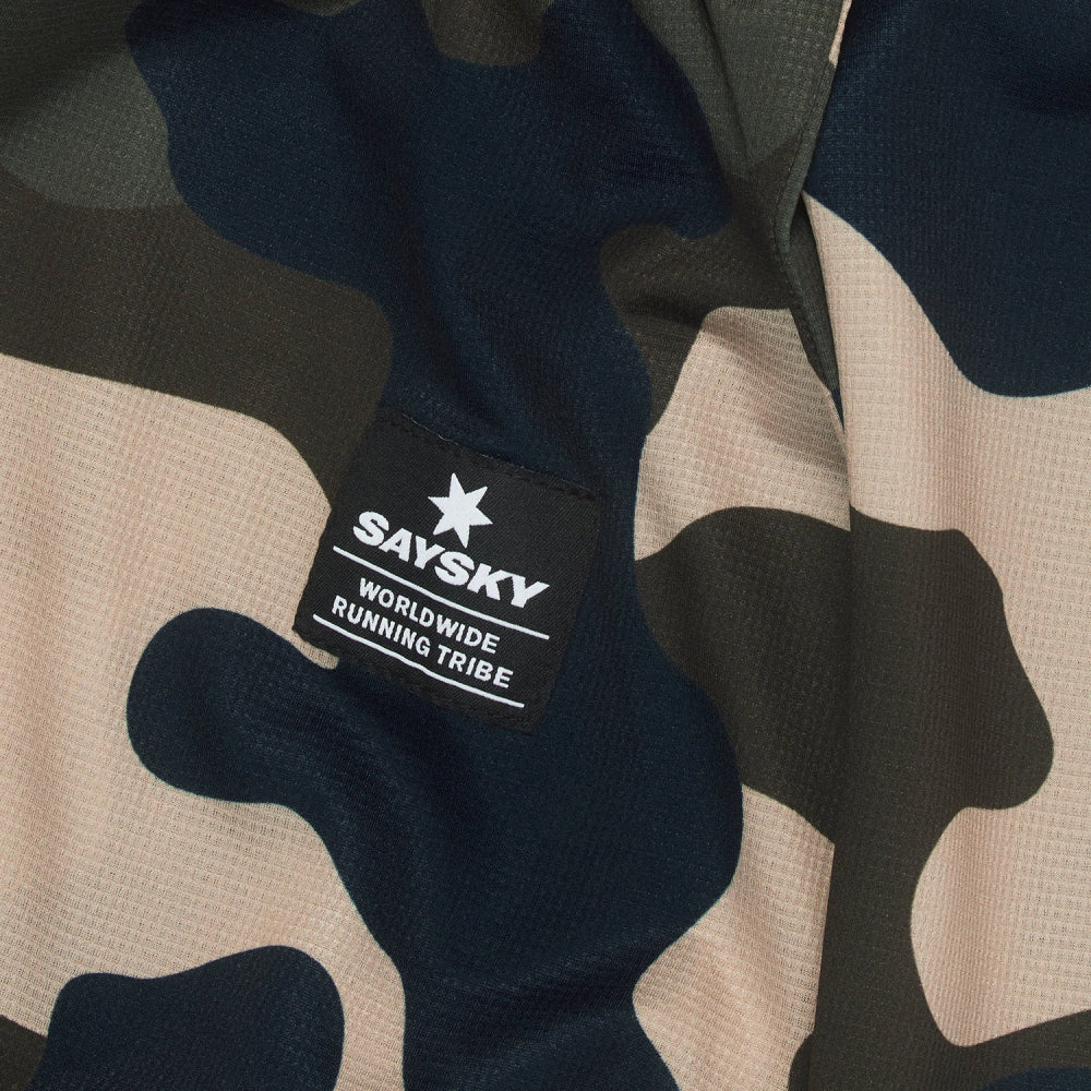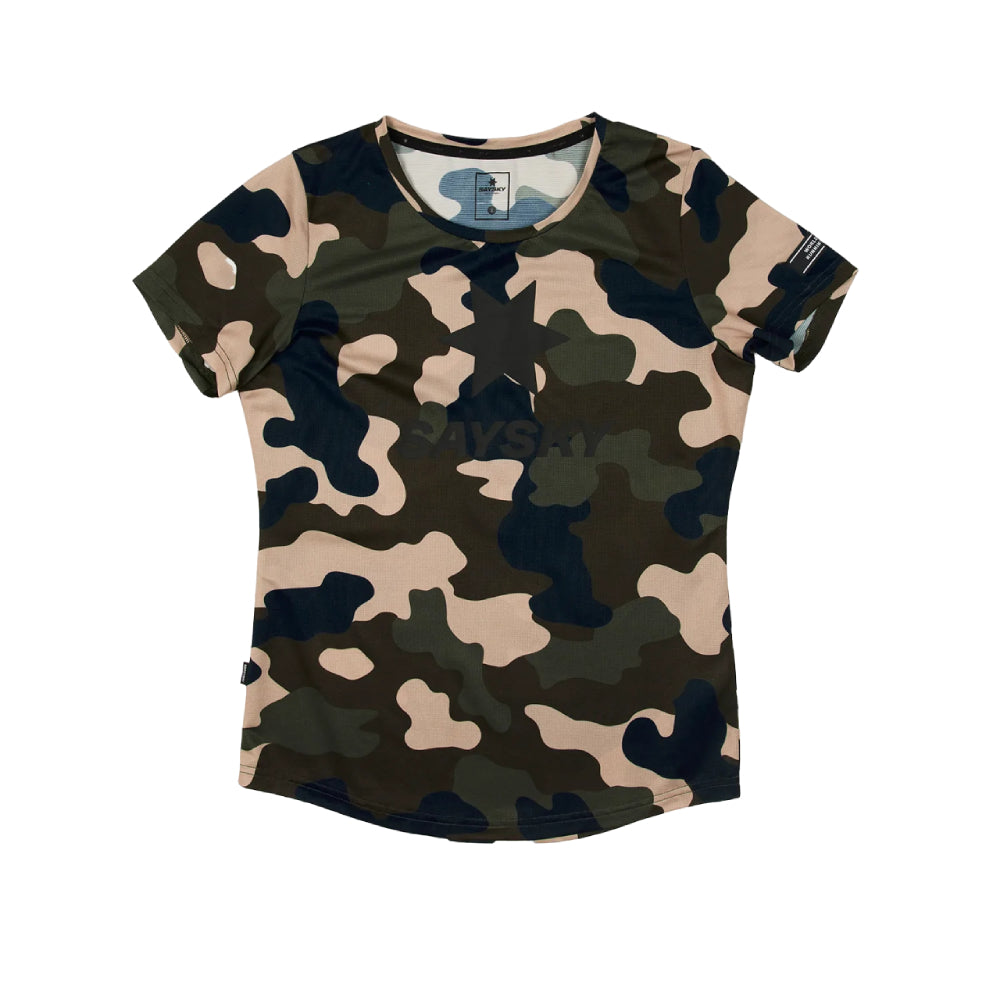 The SAYSKY Women's Camo Combat T-shirt is a short sleeve running t-shirt with a camo print. It's made from recycled polyester and comes with a classic waterprint SAYSKY logo on the front, a woven label on the back, and a WORLDWIDE RUNNING TRIBE label on the arm. The fit is regular with a soft fabric feel and high level of breathability.